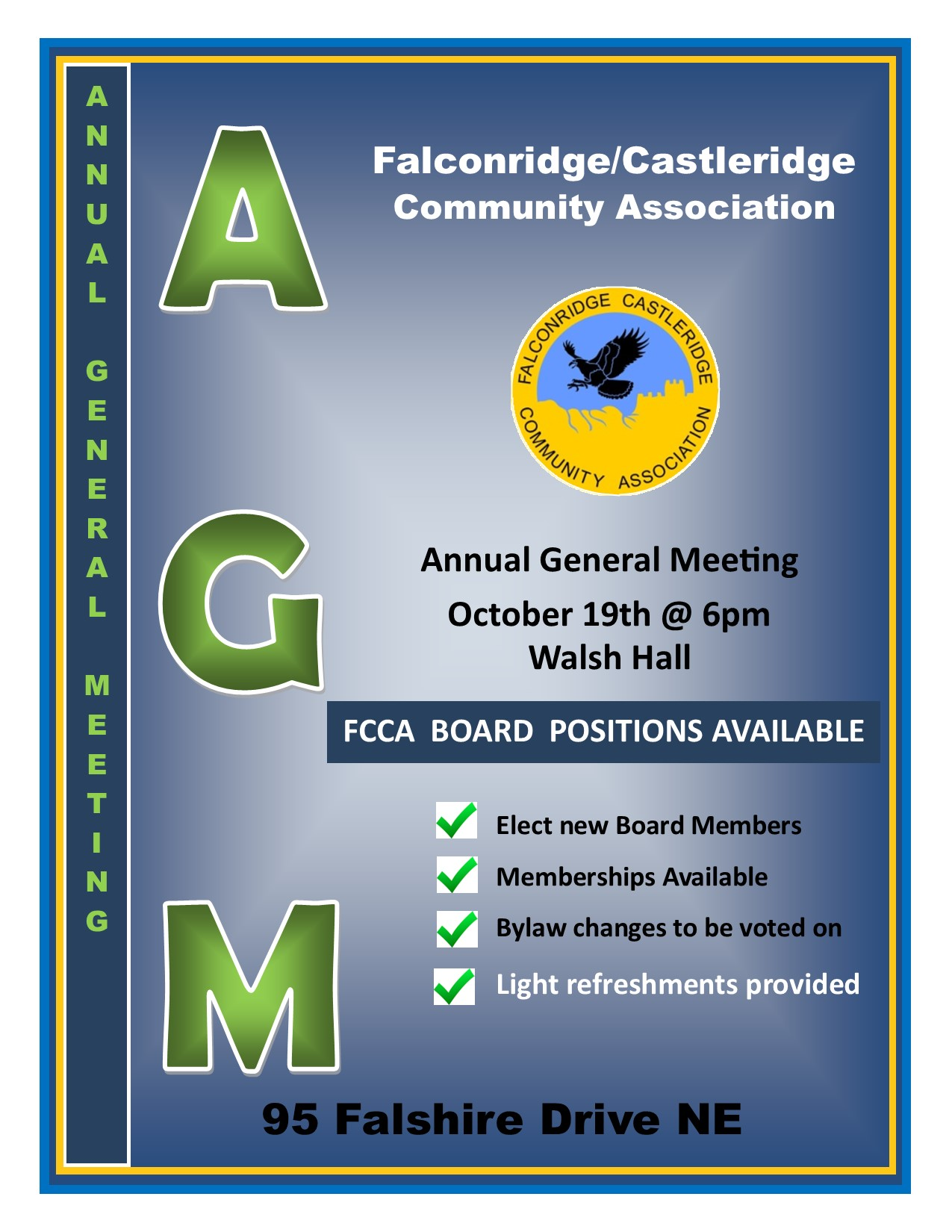 Our Annual General Meeting (AGM) is scheduled for Thursday, October 19th. This meeting is open to all members. Each year we elect new Board Members to assist us in developing and planning events and services for the community. If you are at least 18 years of age and live in Falconridge or Castleridge, then please consider becoming a Board Member. If you are not a member, you can purchase a $10 membership at the AGM, or in FCCA office prior to the AGM. Hope to see you there.